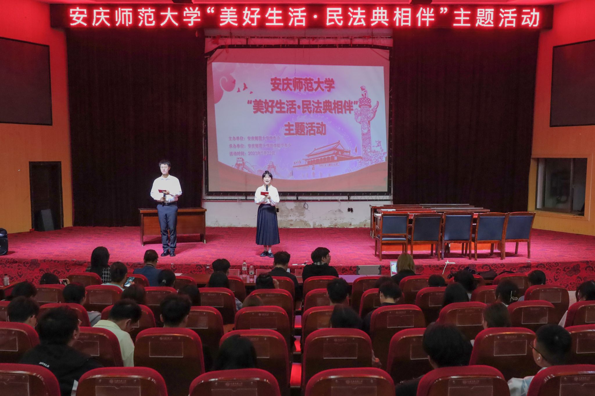 “民法典,新时代人民权利的宣言书。”5月22日,法学院和校学生会在图书馆东厅联合举办“美好生活 民法典相伴”主题活动,通过主题宣讲和知识竞答带领学生深入学习贯彻习近平法治思想,增强学生对于民法典相关法律条文的理解。200余名学生参加此次活动。