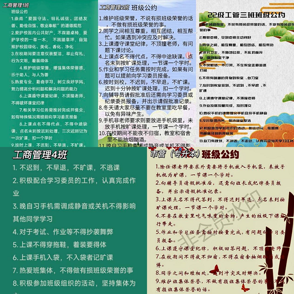 各班的班级公约涵盖了课堂纪律、着装礼仪、同学日常相处等多个方面,内容详细具体,覆盖面广,充分反映了师生们的诉求。工商管理大类2022级1班的班级公约践行了“木受绳则直,金就砺则利”的理念,这有助于构建 “净、静、劲、精、竞”的班级氛围,进一步推动班级建设。