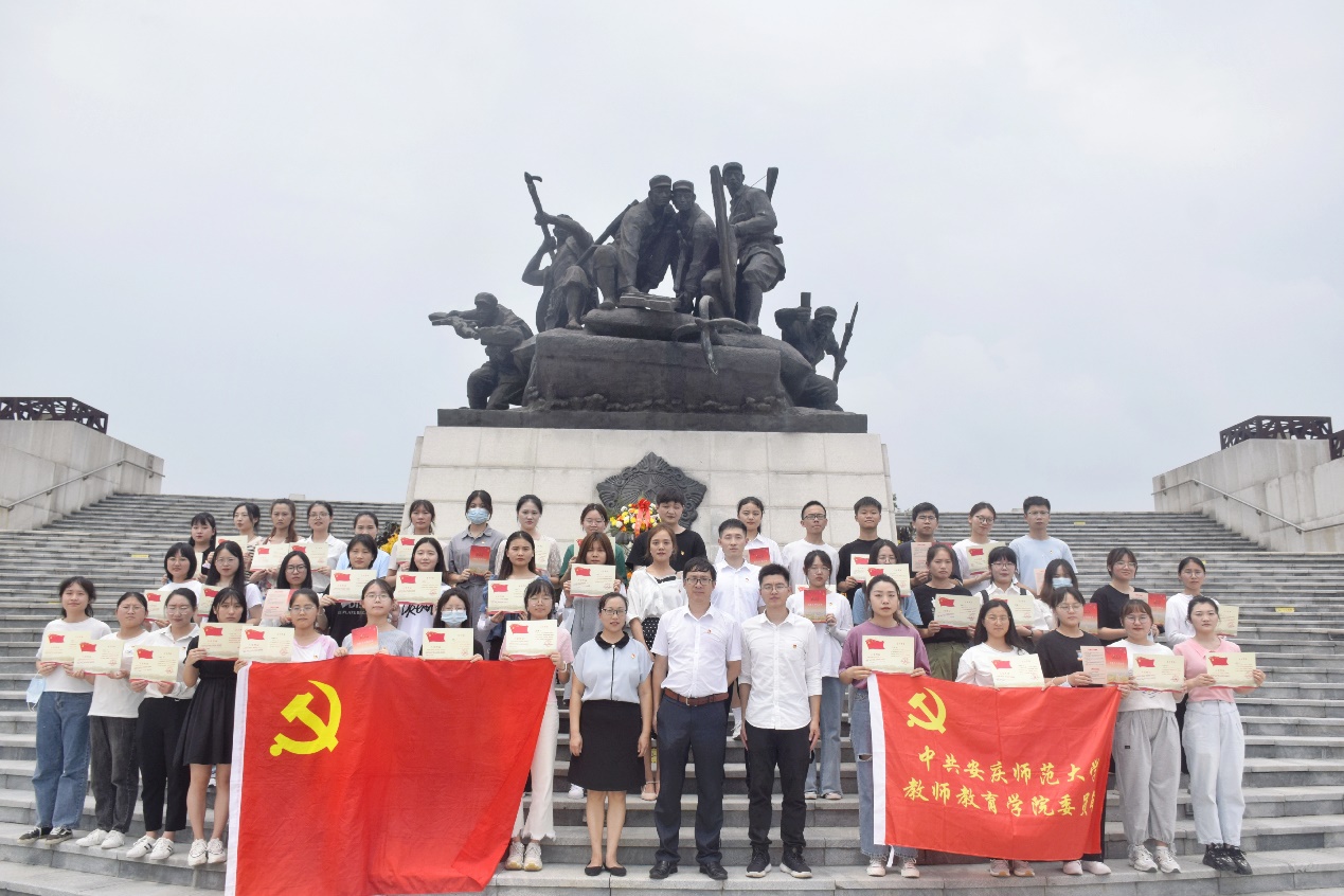 为庆祝中国共产党成立100周年,提高全体党员爱党爱国的热情,引导广大师生党员坚定理想信念、筑牢初心使命、凝聚磅礴力量,6月30日,教师教育学院党委组织42名新党员前往安庆市烈士陵园开展新党员入党宣誓大会,深切缅怀为革命事业献出宝贵生命的英烈。学院党委副书记许世平、各学生党支部书记及全体新党员参加此次活动。