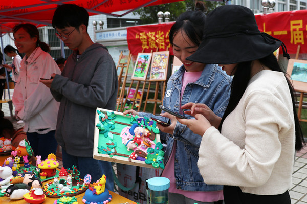 用松果和松针做的鸵鸟、用超轻黏土和石头做的婚纱照、装点着贝壳的台灯……一件件精致的小物件吸引了不少同学驻足观看。5月7日,教师教育学院学前教育专业2017级的同学在敬敷广场举办第十一届“爱凝指尖 童心巧意”学前手工展。