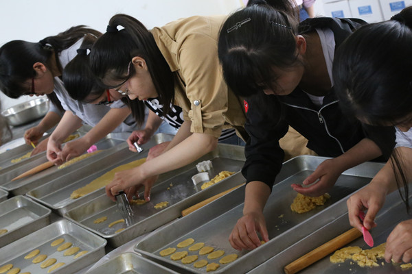 周三下午,起点培训中心一楼的院子里,孩子们正在家长的陪伴下嬉笑,玩耍。十六名志愿者来到二楼的制作室,准备制作手工饼干,作为一天后即将举行的星星义卖的捐款赠送物品。面粉,牛奶,鸡蛋,制作模具和工具被整齐的摆放在桌子上,“先放进面粉2500克,再放进4小包奶粉,36克小苏打……”志愿者们在起点学校老师的指导下,看着重量称上的数字,依次放进各种材料。机器搅拌、发面后,每位志愿者分到一块面团,用擀面杖擀平,再用模具压制。装有花、爱心等形状的饼干被放进烤箱。周三和周四,青协的志愿者们共制作了100袋饼干。“看着自己做的饼干出炉,想到可以帮助小朋友们,真的很开心。”青冀服务队队长周昕怡说,“就像泰戈尔说的,用自己的力量,奉献于生命,便是升华自己的生命。”