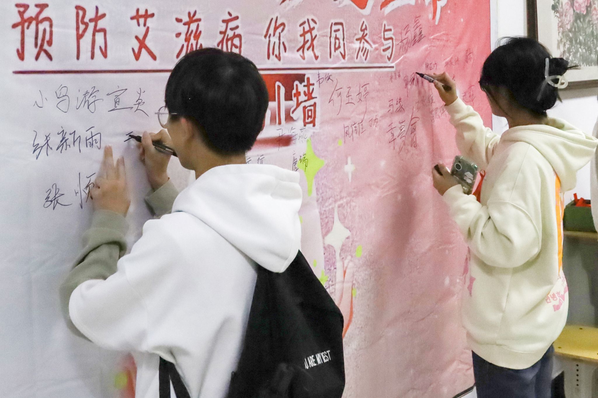 “红丝带是艾滋病防治的象征。”讲座开始前,学生工作人员为前来聆听讲座的学生介绍有关艾滋病的基本知识,并积极引导学生们佩戴红丝带,前往题为“预防艾滋,珍爱生命”的签名墙上签字。学生们纷纷将红丝带佩戴在左胸口处,在墙上书写下自己的姓名。