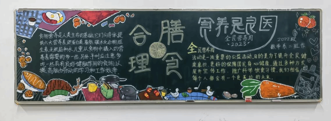 近日,数理学院围绕“合理膳食,食养是良医”的主题,以班级为单位开展全民营养周主题黑板报活动,2022级全年级共15个班级参加。