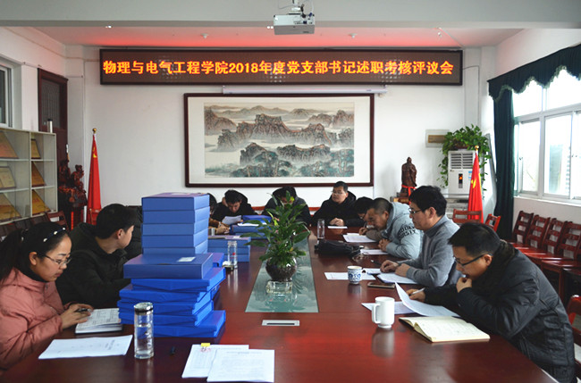 根据校党委《关于做好基层党组织书记抓党的建设述职评议考核工作的通知》要求,1月25日下午,物理与电气工程学院党委在学院会议室召开2018年度党支部书记述职考核评议会,对下属11个党支部进行年度述职考核,考核分查阅支部档案材料和听取支部书记述职汇报两个环节。学院党委书记江贵生,党委委员、副院长董甲东和党委委员江巨浪担任考核评委。