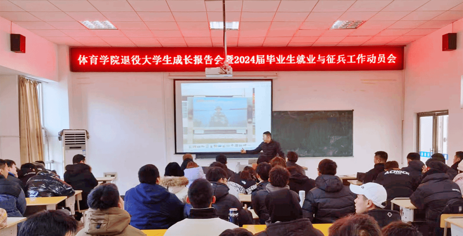 12月25日,体育学院在体育馆多媒体教室举办退役研究生成长报告会暨2024届毕业生就业与征兵工作会。学院党委副书记王玮、毕业班辅导员出席会议,学院全体体教专业毕业班学生参加会议。