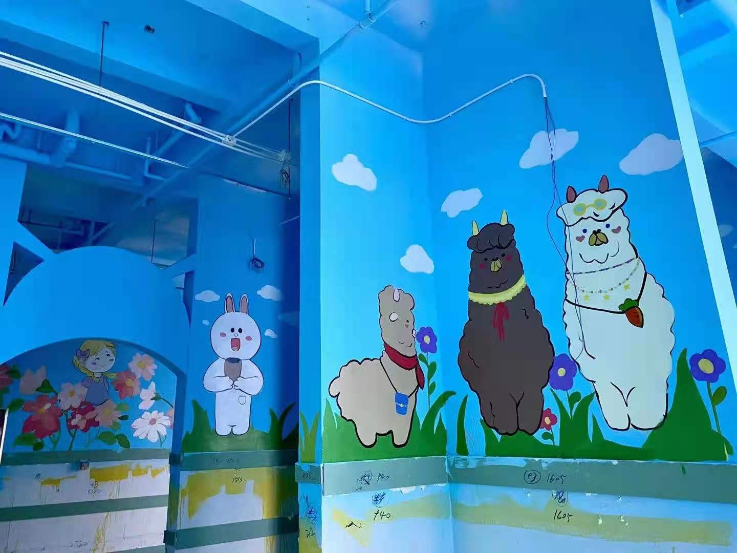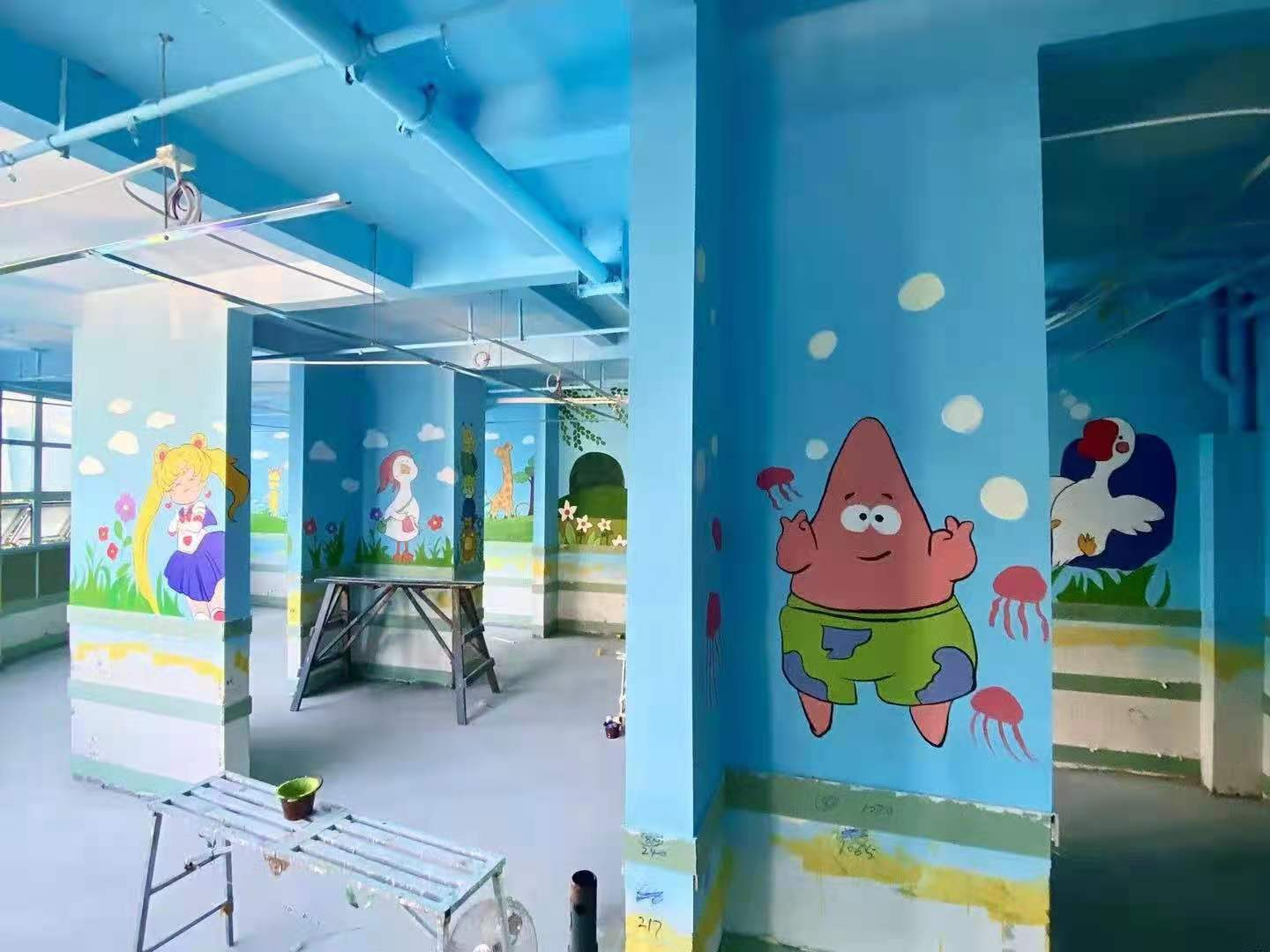 本次墙绘,学生党员们选取了天空蓝作为主色调,同时,用明艳的色彩和丰富可爱的动画角色予以填充,有利于激发孩子们的感知力、想象力。