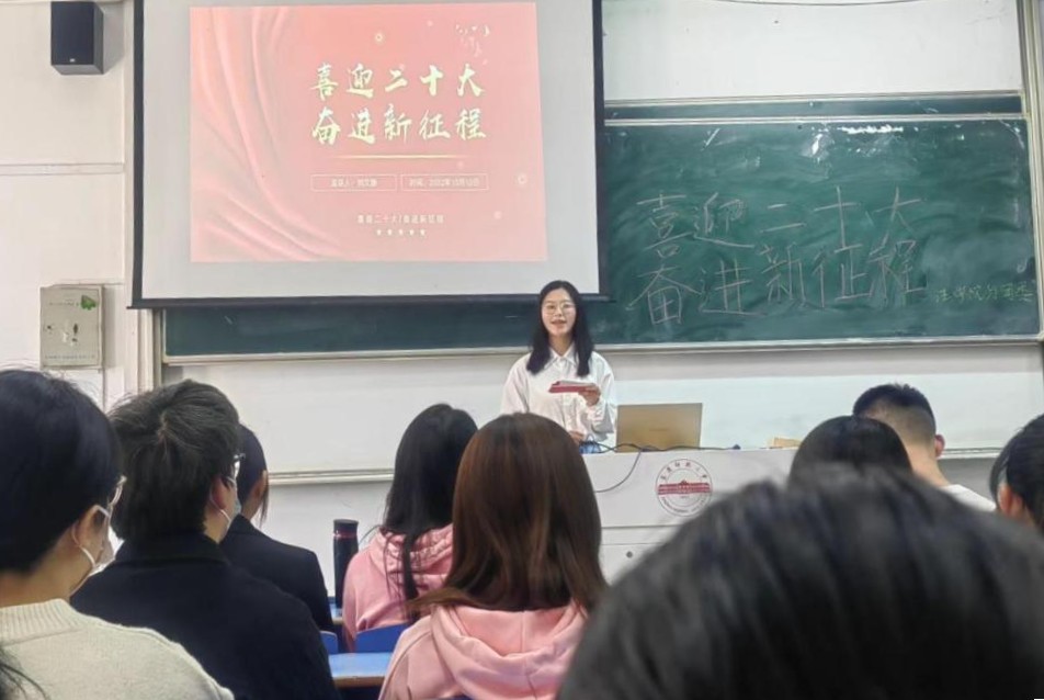 “以‘党的二十大’为关键词在网络引擎中搜索,能找到约五千五百四十万条相关结果……”团日活动的宣讲人、社会工作专业2021级的刘文静在宣讲中带领大家回顾了党的一大到党的二十大的百年奋斗光辉历程。