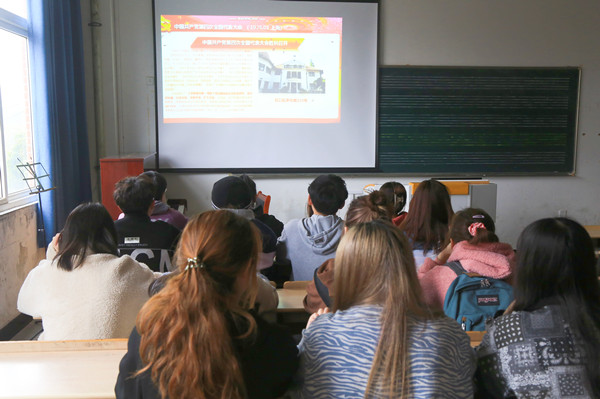 活动开始,学生们观看着屏幕上的党史内容,听着讲解员深情的旁白,沉浸到了视频中波澜壮阔的党史中去。视频以时间为线索,系统地讲述了党的历史发展时期、中国共产党名称的由来、五四运动以及历年来的中国共产党全国代表大会,清晰地还原了中国共产党发展历程。