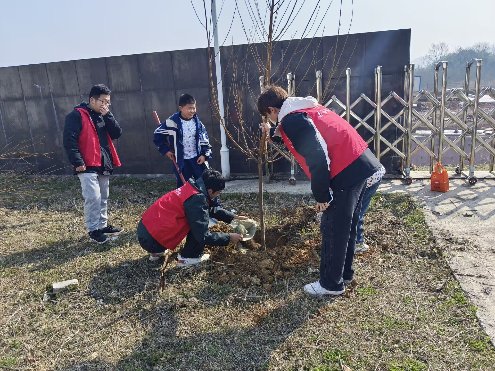 法学院小角志愿队成员带领学生们开展分组实践。在植树活动中,志愿队成员各司其职、齐心协力,全程参与指导和帮助学生进行铲土、松土等工作,并为他们加油打气。虽然大家额头上都沁满了汗珠,但依旧干劲十足。挖坑植苗、铲土入坑,压实新土、灌溉浇水,每个环节都一丝不苟。一个小时后,20颗树苗整齐地种进了土中,每个人脸上都洋溢着劳动的喜悦。
