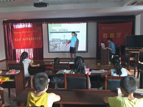 留守儿童由于从小缺少父母监管,在学习的自觉性和学习能力方面相对较差。在安庆市芭茅巷社区开展活动的过程中,实践服务团为帮助留守儿童解决在学习上的困难,给他们提供一个良好的学习氛围。服务团自7月8日起启动“暑假作业周”计划,每天上、下午进行两个课时(共计四个半小时)的免费暑期作业辅导。在作业辅导的过程中,实践服务团队员们也尽量与孩子们多沟通交流,了解各方面的情况。
