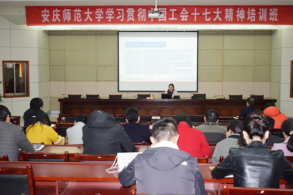 4月10日,beat365官网学习贯彻中国工会十七大精神培训班举行第三场专题辅导报告会,安徽师范大学工会主席赵红应邀来校作报告。