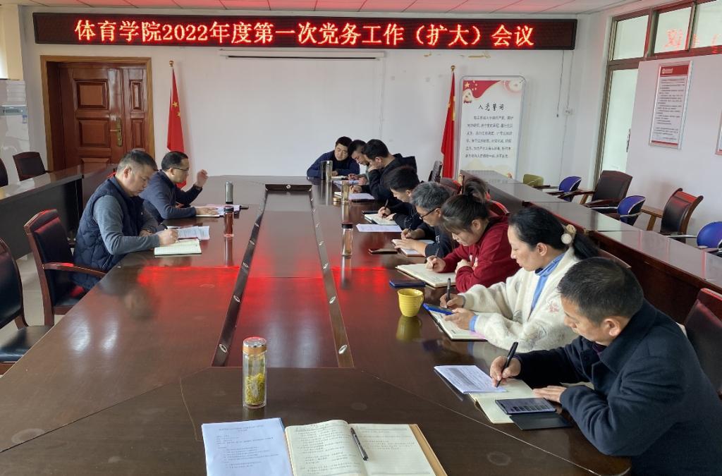为全面落实学校党委要求,进一步推进学院党建工作,3月4日下午,体育学院在体育馆三楼会议室召开了2022年度第一次党务工作(扩大)会议。学院党委书记王开友、党委副书记高栋梁、党委秘书、全体党支部书记和辅导员出席本次会议,会议由王开友主持。