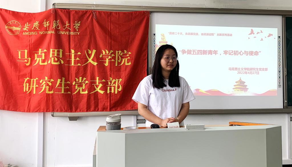 2021级马克思主义理论专业学生董慧霞为大家介绍了“五四运动”爆发的背景和性质,着重讲述了“五四运动”中青年发挥的主体作用,引出“五四青年节”的由来。她表示,作为当代青年,我们应当牢记历史,继承先辈们的遗志,五四精神是中国青年的宝贵精神财富。
