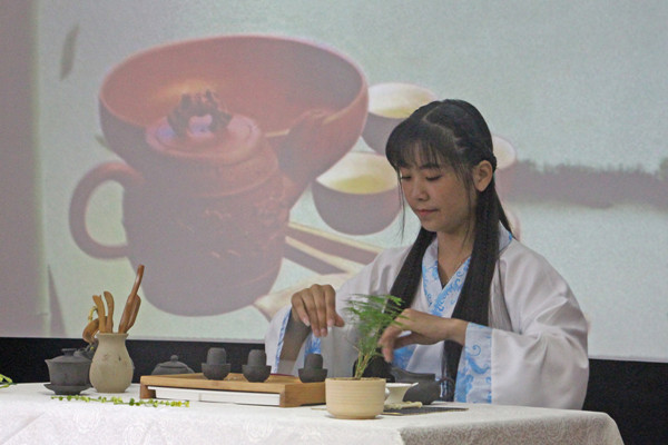 在个人赛中,选手们穿着汉服,进行茶艺表演,表演结束之后选手们展示自己的茶艺创新作品。生命科学学院园林专业2016(1)班的陈菁菁同学结合时代背景设计的道家茶馆得到评委老师的一致好评。