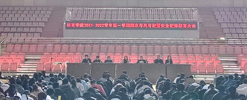 为加强学期末学生教育管理工作,12月14日,体育学院召开2021-2022学年第一学期期末考试考风考纪暨安全纪律教育大会。副院长林秋菊、党委副书记高栋梁、教学办、辅导员老师出席会议,2019级、2020级、2021级本科生和研究生参加会议。