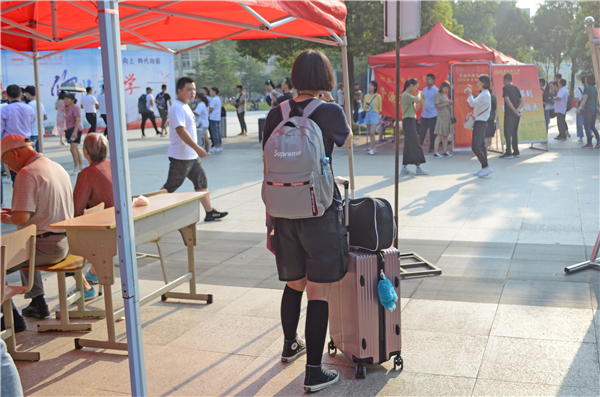 来自池州的聂梦婷是国际贸易专业2019(2)班的学生,中午的太阳晒得她满脸通红。一下车,她就在志愿者的引导下来到了体育馆报到点。“我家比较近,我还跟我爸妈说学校这边有人接送,他们也比较放心。”她笑着说。
