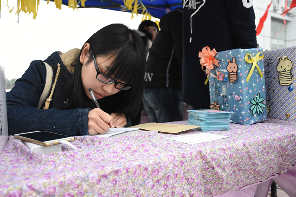 活动现场吸引了许多过路学生参与,投递信箱处站满了学生,他们在寒风中仍然带着感恩的笑意排队。在听到这个活动后,数学与计算科学学院15级数学与应用数学专业的袁增阳说:“我第一时间想到的是我们辅导员,在我入学的短短两年,不论是在学业还是生活上,她都给予了很多关怀,真的很感谢她!”除了写给老师的,还有写给同学的真心的感恩寄语。“我写了两封信给同学,选择了匿名的方式,在信里写下了我一直想说却没机会说出口的真心话,感觉说出口后很开心。”16级数学与应用数学专业的方飞宇说。