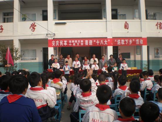 10月26日上午,由民革安师院支部牵头组织的喜迎“十八大”、“送教下乡”活动在迎江区龙狮桥乡长青小学隆重举行。此次活动,民革安师院支部携手民革小教支部共同承办,得到了市委统战部、民革安庆市委、迎江区政府等单位的大力支持,出席开幕式的有民革安庆市委主委程秋月、副主委李秉诚,民革安庆市企业家委员会主任江寒松以及迎江区教育局局长周先为等市、区两级领导10余人。