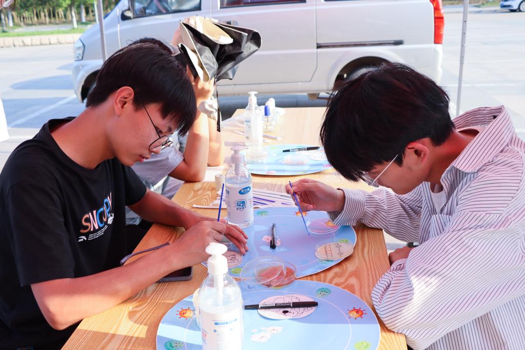 “大家可以在培养皿上印制自己洗手前和洗手后的四指印,等菌落长出就可以看到手上有多少细菌。”运动康复专业2021级的于乐怡被新奇的“玩法”吸引,来到摊位前想一探究竟。在孙小曼的指导下,她完成了“细菌手印”并参与微生物画—团徽的创作中。“团徽是共青团的象征,我想以这种方式致敬建团百年。”她感叹,等待微生物生长的过程奇妙又有趣,原来科学也能如此“浪漫”。