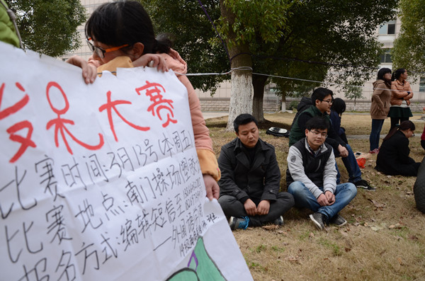 商务英语班同学卖力的搞怪给很多选手带来了很大压力,很多选手被淘汰后大呼“受不了”。14级国际贸易专业的张蒙就是其中之一,她苦苦坚持40分钟,最后还是被淘汰了。“这个活动是在QQ群里看到的,我觉得很好玩,所以和室友一起来参加了。”除了被外界干扰失败的,还有一些人是自动放弃的。“她们的干扰对我没什么作用,我是因为腿坐麻了,只能放弃了。”今年大四的王同学这样说道,“我四年都没参加什么活动,这次看到这个活动,觉得挺好,所以参加玩玩。