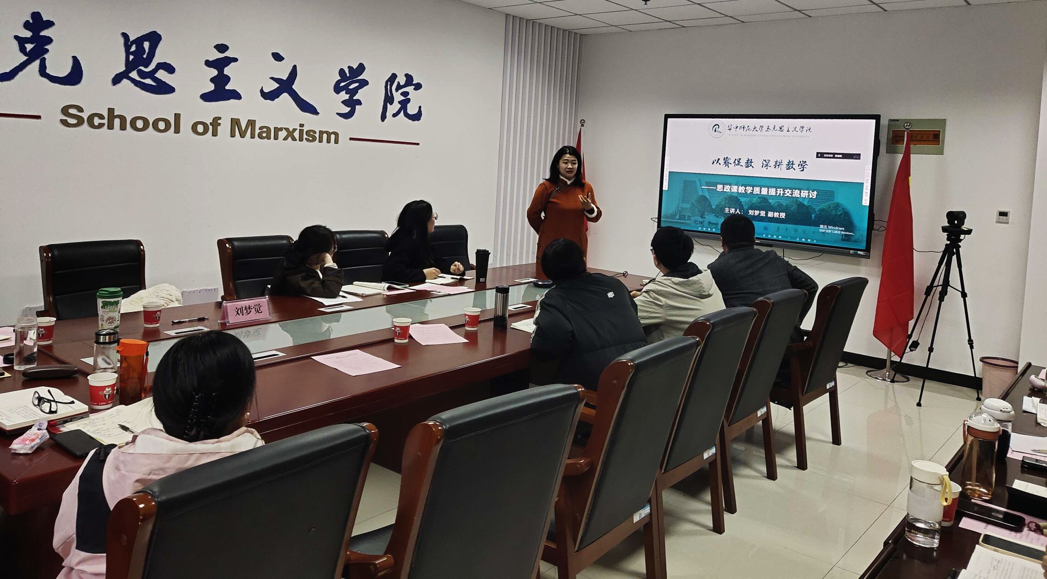 刘梦觉结合自身参加青教赛的经历,强调教学设计在参加比赛和课堂教学中的重要性,认为“教学不设计,心中无底气”,并以“思想道德与法治”课为例,展示了如何做好教学设计,鼓励青年教师在吃透教材的基础上,精心设计教学,构筑高效课堂。