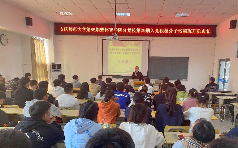 10月12日,体育学院在体育馆多媒体教室举行校第66期暨体育学院分党校第29期入党积极分子培训班开班典礼。学院党委书记徐晓宁,党委副书记、纪委书记王玮等出席典礼,各学生党支部书记、全体入党积极分子共80余人参加了开班典礼。典礼仪式由王玮主持。