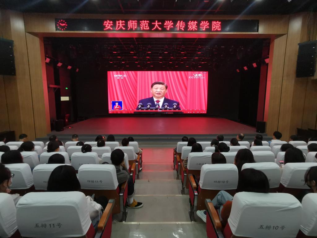 10月16日上午,传媒学院组织学院师生集中观看中国共产党第二十次全国代表大会开幕会。学院党政班子成员、科级干部、党支部书记、管理人员、全体学生党员以及学校第66期入党积极分子培训班的全体学员200余人在学院演播厅进行观看;学院团委、全体学生会成员在k505教室进行观看;各级各专业学生由各班组织在教室观看。