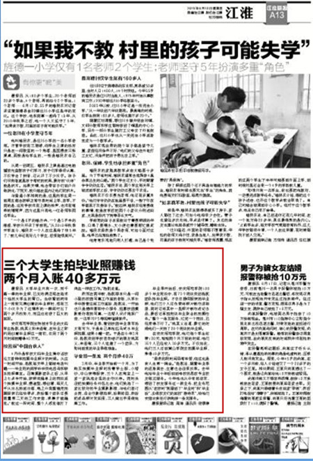 编者按:6月18日,《江淮晨报》刊登了beat365官网学生记者采写的稿件《三个大学生拍毕业照赚钱 两个月入账40多万元》。腾讯、中新网等媒体也予以相关报道。