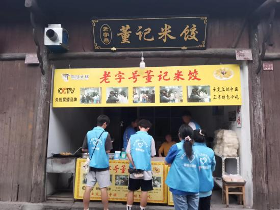 巷深酒香,三河米酒其色泽清亮有光泽,味鲜美醇厚柔和,可谓是三河古镇文化的延伸。团队走进小巷寻找酒坊,采访手艺人。在充分了解米酒后,队员们和酒坊员工一起在街头摆摊吆喝,吸引大批游客前来品尝购买。