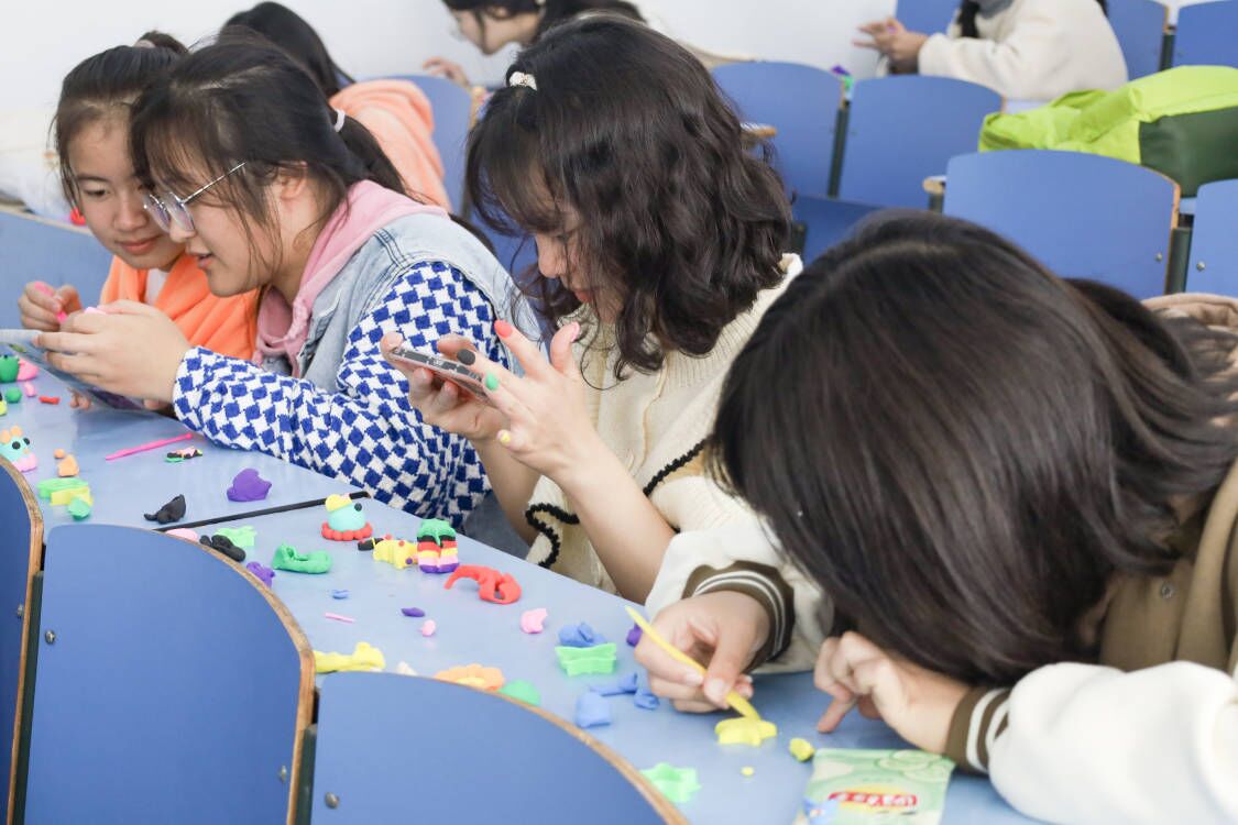 “我以前没有参与过这类艺术疗愈活动,今天发现真是来对了!”刚进入大学的“小萌新”、机械设计制造及其自动化专业2022(1)班的张磊表示学校的活动非常精彩,给了他十足的惊喜。由于没有黏土制作经验,在DIY创意手机壳时,张磊向有经验的学生请教制作方法,“活动的氛围太好了,同学们都很乐意将自己的技巧教授给我,我还交到了几个朋友呢!”