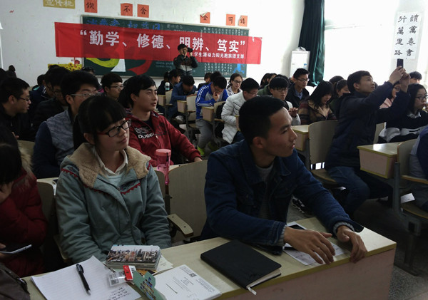 讲解结束后是趣味问答和好书推荐环节。“八字真经的基础是什么?”主持人话音未落,好几个同学站了起来,“勤学!”“请列举四位感动中国人物”.......抢答环节十分火热,在座的同学们都争先恐后地举手抢答。同学们用他们的热情表达了对这个活动的喜爱。来自14级数学与应用数学专业的姜燕连续抢答了多个问题。“我本身就是比较活跃的一个人,像这种活动环节我还是很喜欢的,我觉得团日活动就应该教育与快乐并存。”好书推荐环节中,大家把自己平时珍爱的书纷纷和大家分享。“我给大家推荐一部书《拆掉思维的墙》,这本书正如其名,说的是新思维,鼓励大家突破禁锢的思维方式,勇敢尝试,勇敢创新.......在娱乐的当下我们更要多看看历史沉淀下来,比较精华的书,相信看完之后会给我们带来一些不一样的思考。”14级机械一班的唐夏青同学说。接下来还有六位同学向大家推荐了他们最喜爱的书。
