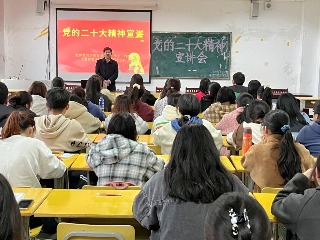 11月16日,教师教育学院在J305举办党的二十大精神宣讲会,学院党委书记陈志超做主题宣讲,学院学生党员和班级骨干约80余人参加宣讲会。