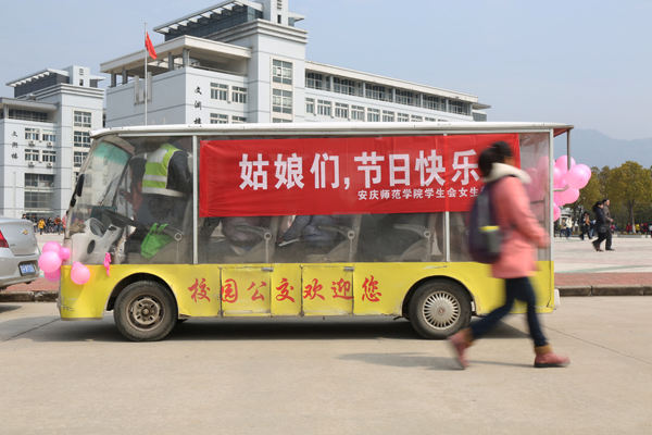 “小主们,请上车”“师院女生,节日快乐”, 3月7日,八辆挂着条幅的“公主校车”穿行在校园里,只要女生穿的衣服与校车上绑的气球颜色一样,就可以全天免费乘坐校车。“我们惊呆了,没想到校车也会‘卖萌’。”外汉专业12级的王玉莉笑着说。早在女生节的前一天晚上,安庆师范学院学生会女生部的成员们就把所有的校园公交都装饰了一遍,挂上五彩缤纷的气球,拉上鲜艳的条幅,瞬间就把它们改造成梦幻的“公主校车”。“公主校车”载着穿着五颜六色的姑娘们行驶在校园里,为持续两周被阴雨天气笼罩的安师院增添了一抹暖色。