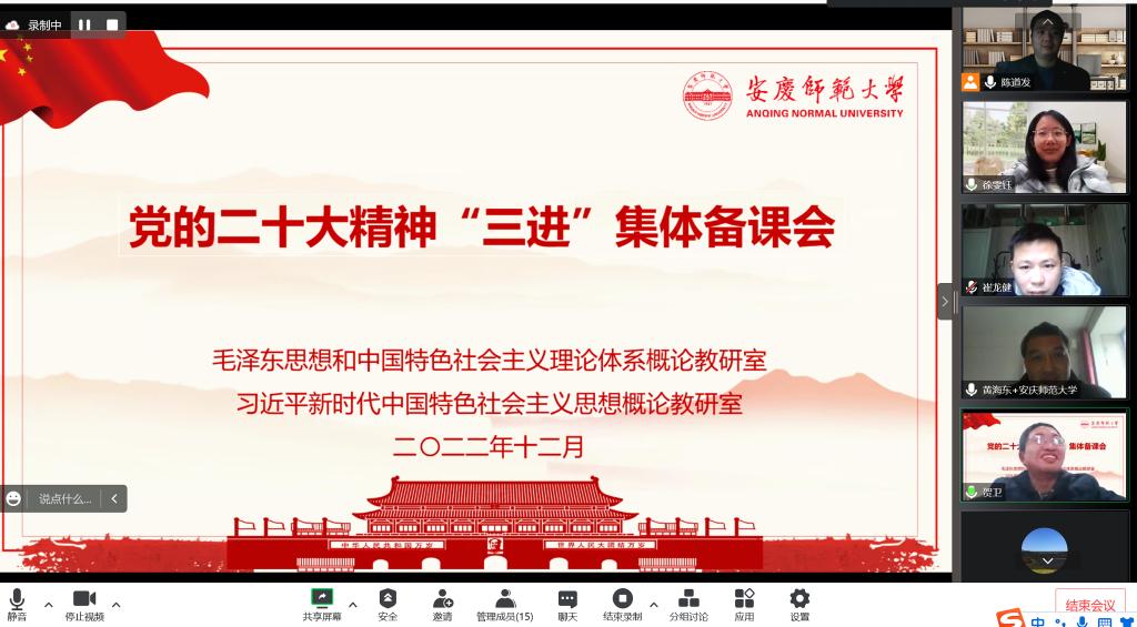 12月7日,马克思主义学院毛泽东思想和中国特色社会主义理论体系概论教研室和习近平新时代中国特色社会主义思想概论教研室联合举办党的二十大精神“三进”集体备课会。教研室全体专兼职教师线上参加会议。