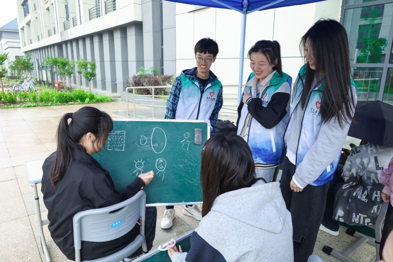 商务英语专业2021级(2)班的汪怡乐与队友率先参与“你画我猜”体验活动。作为队内的画手,她在黑板上画出标有“1919年5月4日”字样的圆圈,并作着重符号,成功提示队友答出了“年轻人是五四运动的主体”的正确答案。“在参与过程中,我重温了有关团史、青年运动史的知识,增强了对五四精神内涵的理解。”汪怡乐说。