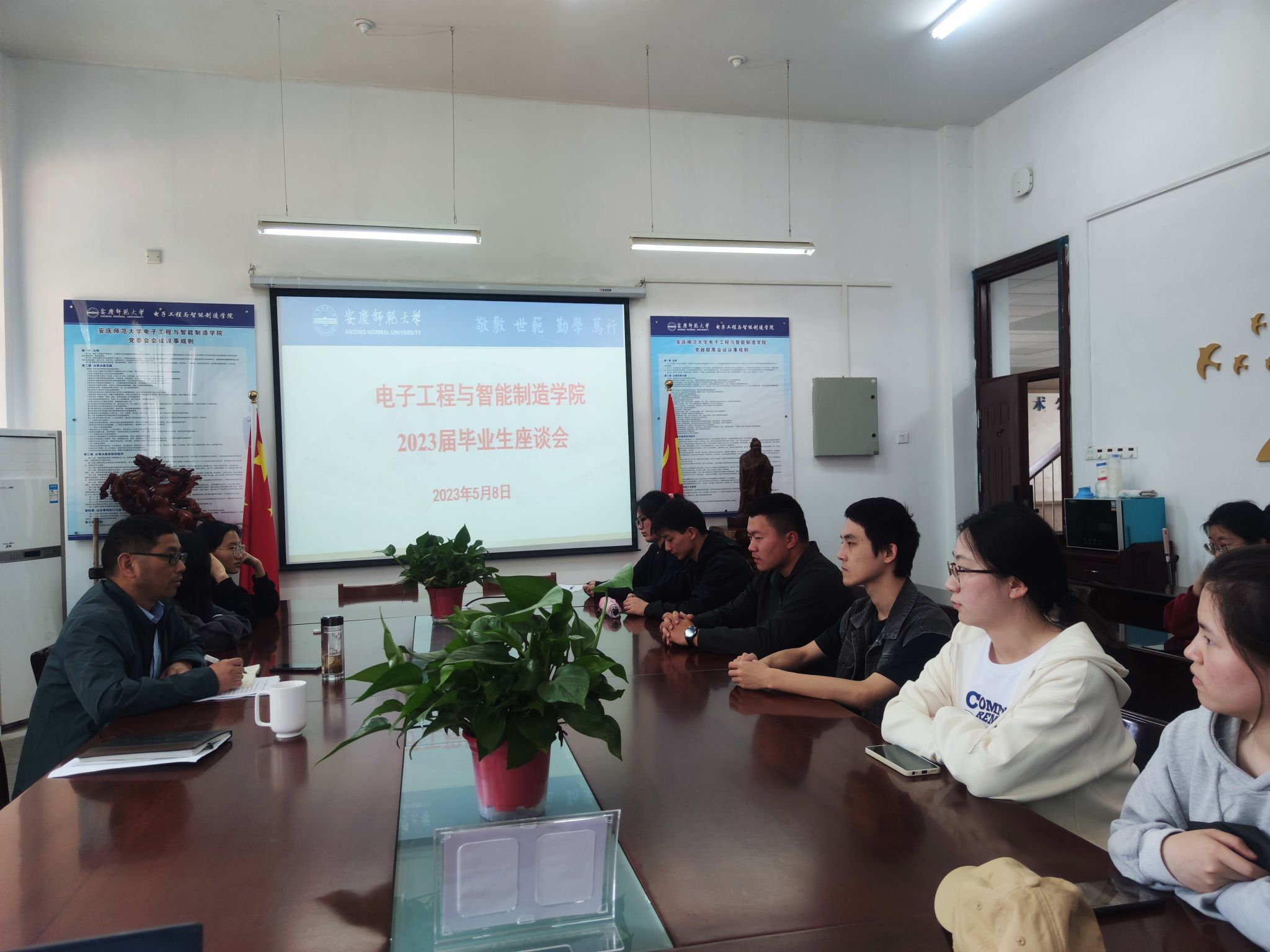 5月8日,电子工程与智能制造学院2023届毕业生代表座谈会在稼先楼南119会议室举行,会议就学院教育教学管理及专业人才培养方案等方面倾听和收集毕业生的意见。学院副院长章礼华出席会议,各系主任、教学办公室相关教师及2023届毕业生代表参加会议,章礼华主持会议。