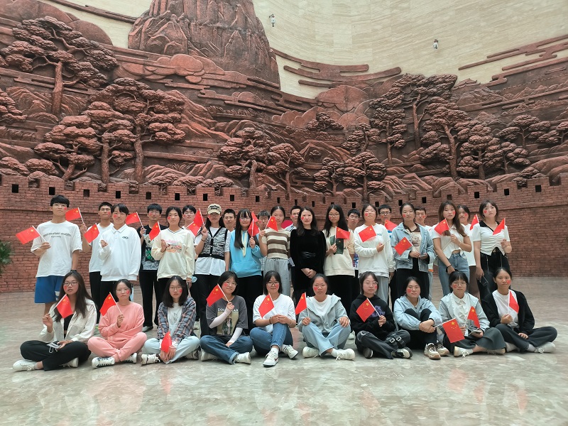 参观结束后,辅导员给同学们分发了国旗和国旗贴纸,同学们纷纷手举国旗,脸贴国旗贴纸,拿出手机拍下了与国旗的合影。“我和我的祖国,一刻也不能分割……”,合影结束后,在孙芮的带领下,同学们共同唱起《我和我的祖国》,大家挥舞手中的国旗,放声高歌,共同祝福伟大祖国的73周年华诞。