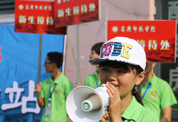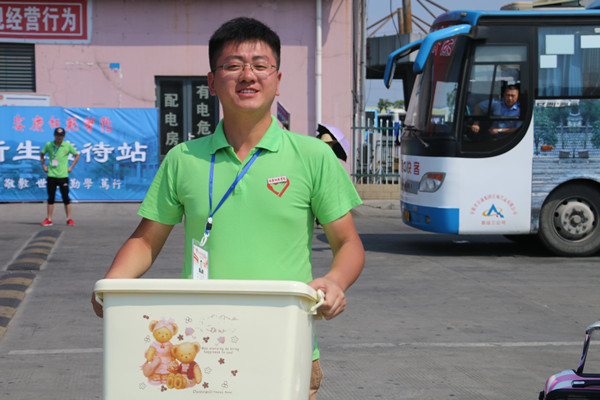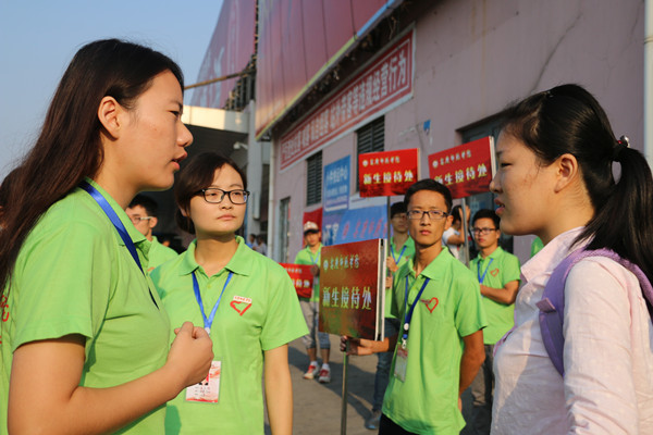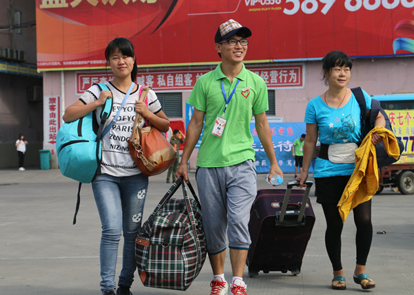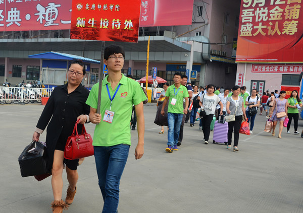 9月10至11日,安徽安庆。安庆师范学院一支由学生社团联合会和校学生会组成的志愿迎新队伍身着绿衣在安庆市汽车客运总站迎接新生。