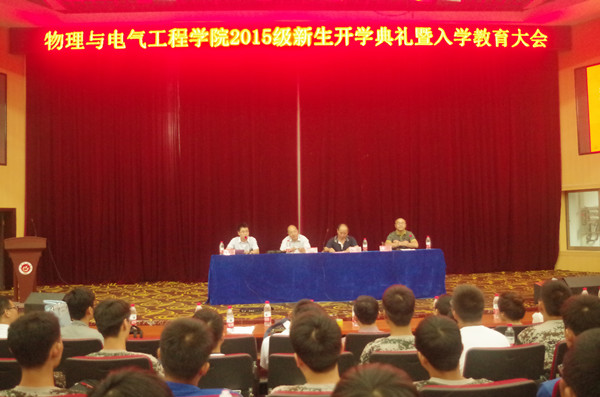 教师代表章礼华教授指导新生要抓住基础课程、学好专业课;学生工作办公室蒋立永老师宣读了《物理与电气工程学院2015级新生入学教育实施方案》;老生代表郭燕如分享了她大学的经历和感悟;新生代表做了宣誓。(学生通讯员 杨慧)