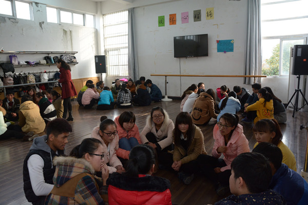 他们通过“信任之旅”“滚雪球”“棒打薄情郎”这样的游戏,促进彼此的认识。属于过渡期的莫过于“滚雪球”这个活动,55个人分成5个小组,每个小组有个小组长,从小组长右边同学开始说:“我是来自哪里的喜欢什么的某某。”以此类推,后一个同学在介绍自己的时候都要从小组第一个同学开始讲起。“这位是来自安庆的喜欢音乐的……我是来自安庆喜欢英语的罗京。”第三小组的组长罗京一个不落地讲道。当被问及为什么能够如此详细的记住每个人的信息,她说:“就是很认真的聆听,并根据她们各自的特点进行记忆。”宋志英老师也说,这是需要认真倾听他人讲话才会做好的游戏。