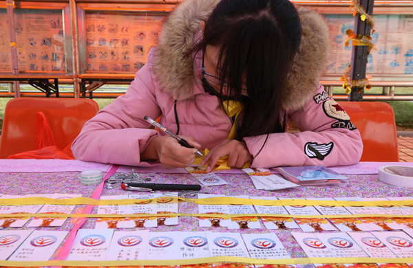 11月23日,从早上八点开始,敬敷广场“学生四成服务大厅”的组织者们就已搭好帐篷。象征着感恩的黄丝带在帐篷内飞舞,编成花朵形状的彩色丝带为冬日阴天带来活力。在工作台上,陈列着卡片信封,卡片用来写箴言,信封用来邮寄感恩信件。