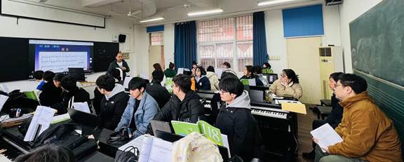 3月22日上,音乐学院教师杨飞虎在艺术楼B楼201教室开展了《即兴与键盘和声》课程的公开课教学。学院副书记肖之进、副院长徐冉与部分教师、研究生代表共同观摩了本次课程。