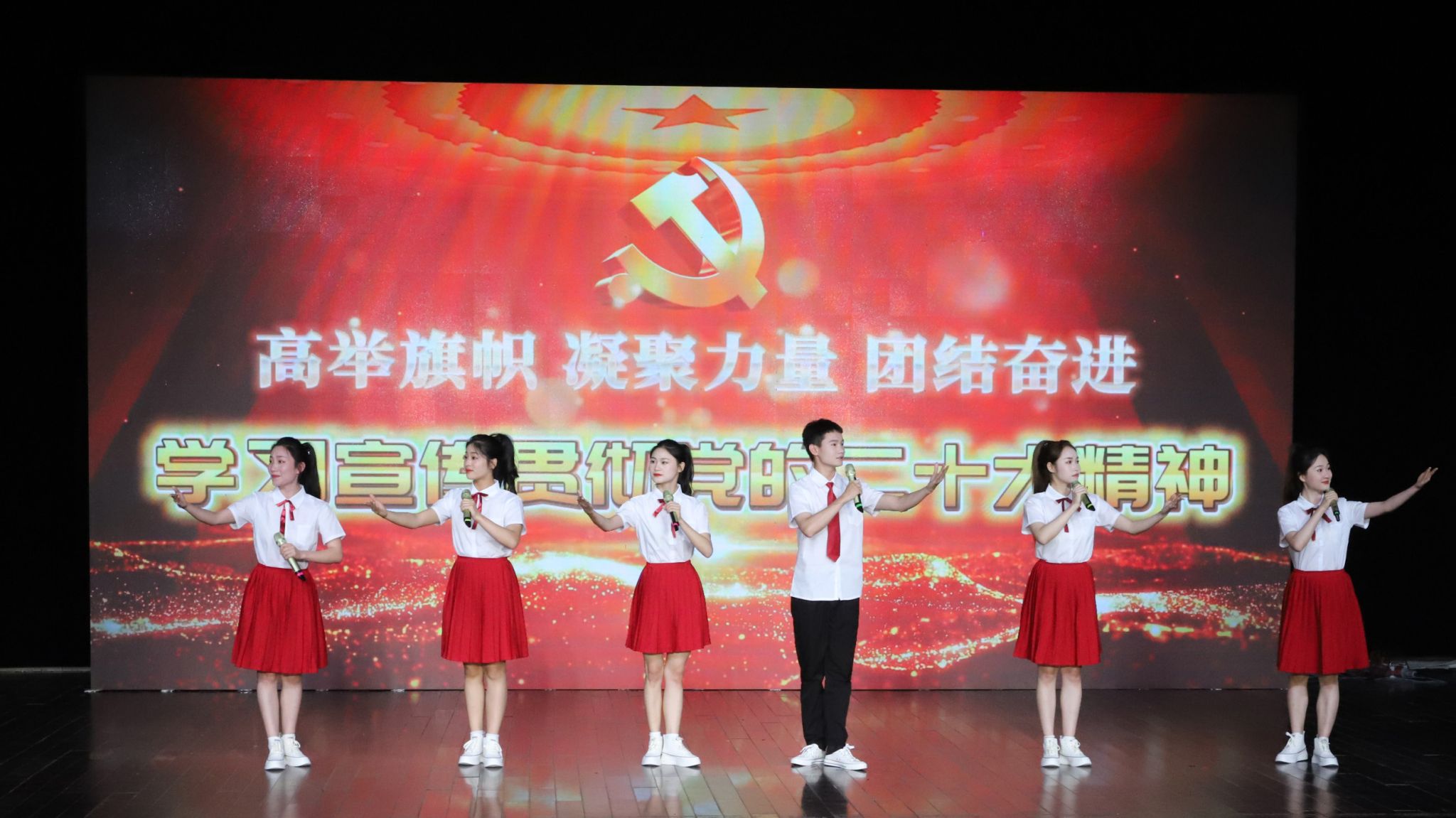 丝竹管弦赞盛世,高扬青春风采;欢歌起舞颂丰恩,尽显红心向党。声乐组作品《满江红》《城南送别》带领现场观众在跌宕起伏的旋律中,感受革命走向胜利的伟大历程;戏剧组作品《戏韵悠扬讴歌党》《黄梅大鼓——百年华章》将中国共产党的思想路线、指导方针和初心使命融入表演,礼赞党的光辉历史;朗诵组作品《我的祖国》《我们不会忘记》艺术化融合声与情、声与象,于平仄之声中体现家国情怀;器乐组作品《皮黄》《西部主题畅想曲》透过微颤的琴弦,用激昂的曲调唱响青春;舞蹈组节目《同心共筑中国梦》《天涯共此时》以流畅协调的动作,展现积极健康的精神风貌,激励新时代青年奋发向上、勇毅前行。