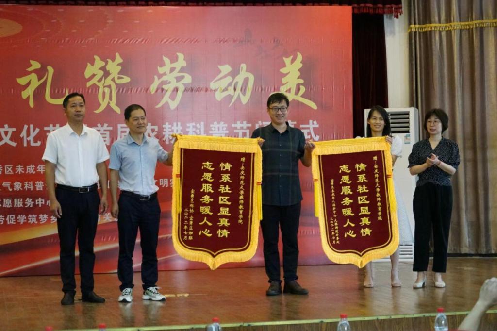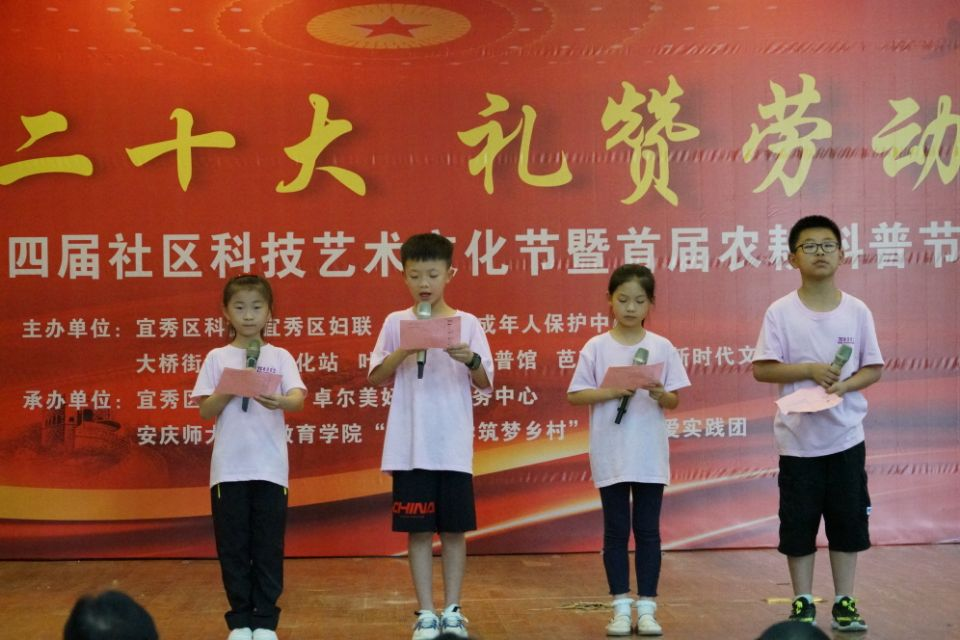 7月15日,由教师教育学院“以劳促学,筑梦乡村”教育关爱暑期“三下乡”实践团参与承办的2022年宜秀区第四届社区科技艺术文化节在宜秀区芭茅巷社区落下帷幕。各主办、承办单位相关负责人参加闭幕式。教师教育学院党委副书记许世平,宜秀区科协主席李愉乐,宜秀区民政局副局长闻斌等领导出席本次文艺汇演暨闭幕式。本次仪式由实践队员程思攀主持。