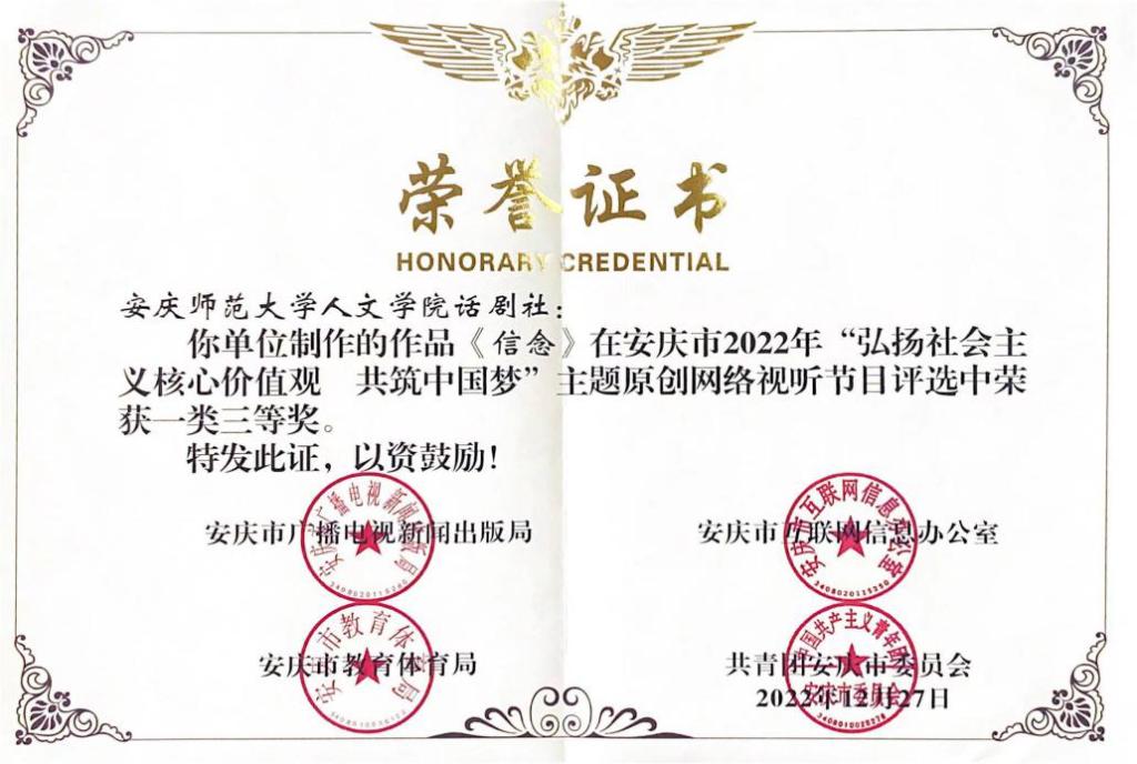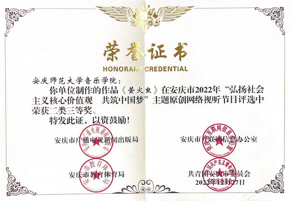 日前,由安庆市广播电视新闻出版局、安庆市互联网信息办公室、安庆市教育体育局、共青团安庆市委员会联合开展的安庆市2022年“弘扬社会主义核心价值观 共筑中国梦”主题原创网络视听节目活动获奖结果揭晓。beat365官网音乐学院原创作品《萤火虫》获得二类三等奖,人文学院话剧社原创作品《信念》获得一类三等奖。