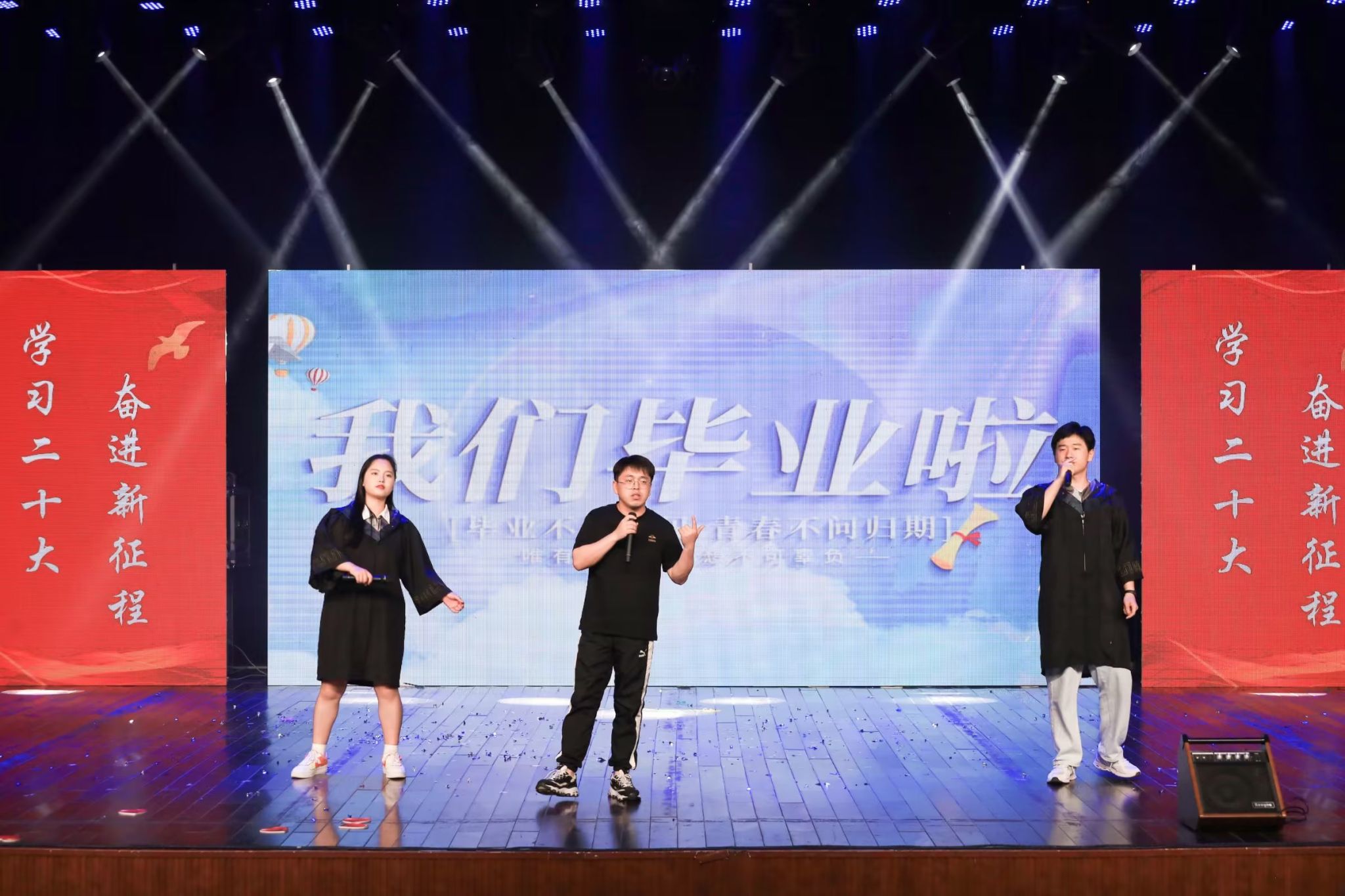 本次晚会由“青春不殆,梦想不灭”“念恋昨夕,行且珍惜”“畅想青春,行远思恩”“梦想起航,记忆留夏”四个篇章组成,采用线上线下同步进行的方式。学生们除了可以在现场观看演出外,还可通过抖音直播“云”欣赏精彩表演,沉浸式体验晚会氛围。手写信、短视频、回忆录……在晚会现场的大屏幕上,毕业生的大学生活碎片、学弟学妹的祝福、教职工的期盼语录轮番“上演”,师生欢聚一堂,共同感受学院“大家庭”的温暖。