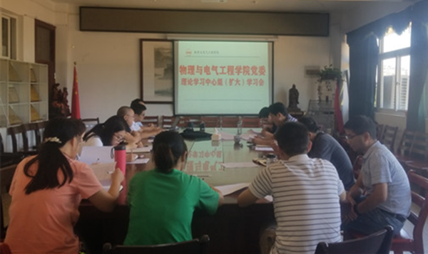 9月23日上午,物理与电气工程学院在学院会议室召开党委理论学习中心组(扩大)学习会,专题学习习近平在“不忘初心、牢记使命”主题教育工作会议上的讲话内容和精神。学院全体党委委员和党支部书记参加了会议。会议由党委书记江贵生主持。
