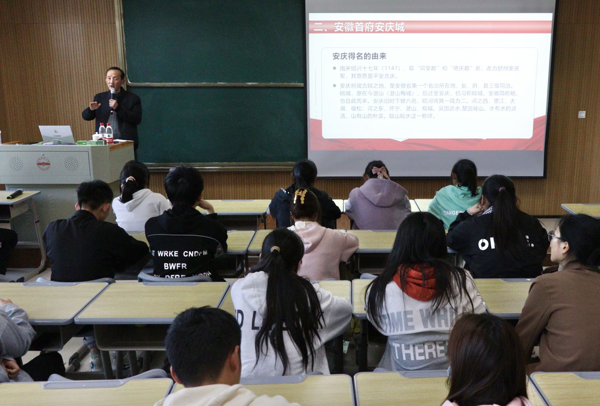 “南宋绍兴十年,改名为舒州安庆郡,其意义是平安喜乐。”吴曦翔向学生介绍安庆这一名字的由来,并以诗句“万里长江此封喉,吴楚分疆第一州”为引,从安徽首府安庆城,安庆城附近的遗存,安庆地名楹联、诗趣、故事,安庆之最以及安庆饮食文化等五个方面展开详细叙述。