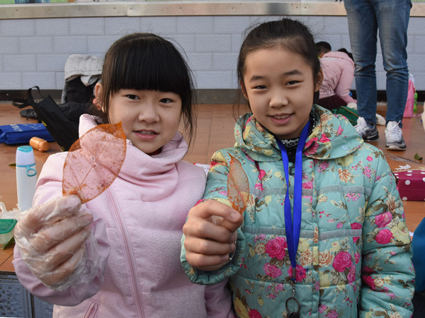 制作叶脉书签时,孩子们拿起刷子在树叶上仔细小心地刷洗着。5年级(4)班的胡奕凡一连做了两次才成功,他笑着说:“看起来简单,其实第一次做的时候没那么容易。” 5年级(2)班的王奕辰在制作成功之后,还教起了其他的同学。看到孩子们制作出来了完整的叶脉,不少在一旁等待的家长也纷纷围了过来,拿起手机拍照留念。