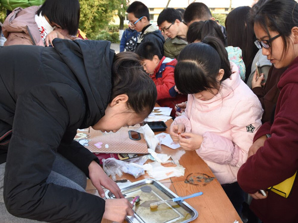 在向同学们演示完“叶脉书签”和“水晶标本”的制作过程后,同学们被分成30个小组,由协会成员带领,分别完成不同的制作实验。